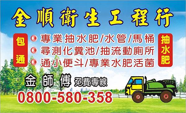 本公司自成立以來,我們堅持「誠實至上」、「價格合理」、「服務品質」和「真誠態度」的經營理念,在大桃園內各級機關、大樓、公司、工廠、學校、餐廳、飯店、及一般住宅提供化糞池清理,抽水肥,通水管,通馬桶...等等最佳服務,金順非常重視顧客的需求,採用專業機器處理複雜的問題,既快又有效率,專門處理:通馬桶、通水管,抽化糞池,解決您工廠及居家汙水問題,並擁有行政院環保署認證(乙級廢棄物清除處理證照)
